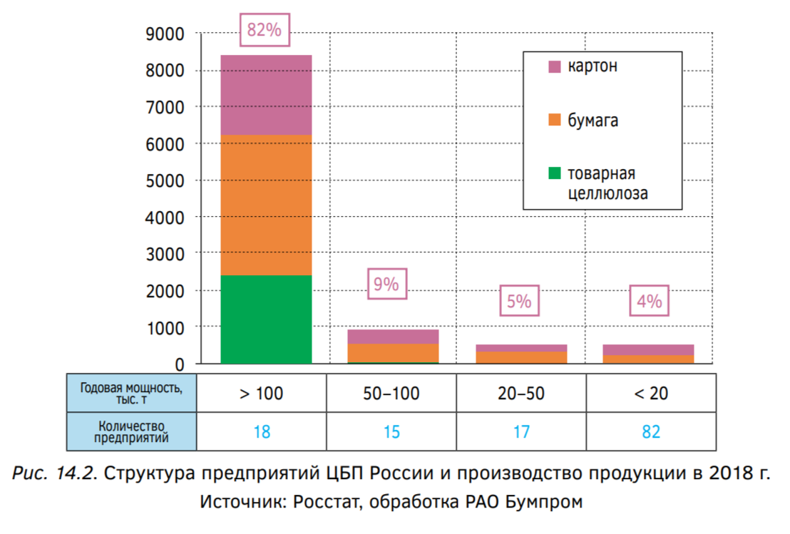 В 2018 г. в России действуют 132 целлюлозно-бумажных предприятия. Крупнейшие заводы — всего их около 20 — расположены в Архангельской, Иркутской, Нижегородской областях, Республиках Карелия, Марий Эл и Коми, Пермском крае. На рис. 14.2 представлена структура предприятий ЦБП России и производство продукции в 2018 г. Как видно из рисунка, на 18 предприятиях с годовой производительностью более 100 тыс. т. произведено 82% продукции, на 15 предприятиях с годовой мощностью 50–100 тыс. т выработано 9% продукции, а на 99 предприятиях мощностью менее 20 до 50 тыс. т также произведено 9% продукции.