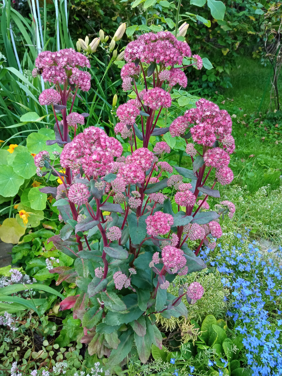 Ну вот могут же ученые-стстематики иногда давать простые, понятные названия. Большой - это значит на самом деле самый большой. В смысле высокий. Но и крупный тоже. По крайней мере, порывшись в справочниках и интернете, я не не нашла вида более высокого. Единого мнения насчёт того, отдельный это вид (sedum maximum) или разновидность очитка обыкновенного (sedum telephium subsp. maximum), нет. Мне больше нравится считать, что это отдельный вид. Это мощное растение высотой до 80 см. Стебли, приподнимающиеся от основания, прямые, на верхушке немного ветвящиеся. Часто окрашены в красный цвет. Листья крупные, продолговатые. Цветки розоватые, собранные в щитковидно-метельчатое соцветие. Помимо видового очитка, в садоводстве распространены многочисленные садовые формы и сорта, различающиеся высотой, окраской листьев и цветков, а также временем цветения. В моём саду растёт, скорее всего, не видовой очиток, а какой-то сорт, но вот как он называется, я не знаю. Попал он в сад необычным способ