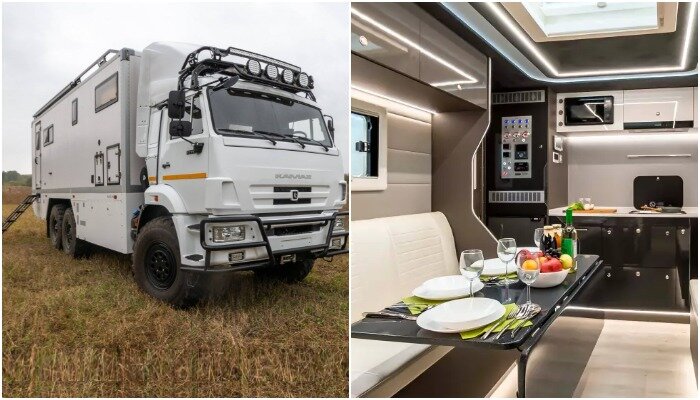 Примечательно: Для комфортного проживания длительное время в КАМАЗ-43118 Волгатрейд предусмотрено: гостиная-столовая, кухня с холодильником, мойкой, водяным баком на 400 литров, плитой, микроволновой печью, полным комплектом столовых и кухонных приборов, посудомоечной машиной, массой шкафчиков и даже винным шкафом. Помимо этого, имеется отдельный туалет, ванная с душем и турецким хаммамом, прачечная с полноценной стиральной машиной, гардеробная и кладовая. Спальные же места можно организовать в зоне гостиной, в столовой и в кабине, а для владельцев предусмотрена отдельная спальня.