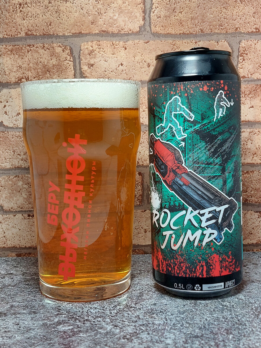 American IPA от московской пивоварни SELFMADE. Описание напитка с ресурсов пивоварни: "Противники на подходе, сердцебиение участилось, ситуация безвыходная. Рассчитывать больше не на кого. Всё, либо риск, либо цинк. Вы стремительно направляете свою верную ракетницу под ноги, подпрыгиваете и, недолго думая, нажимаете на спусковой механизм. Ударная волна несет вас вверх на сумасшедшей скорости, оставляя с носом злопыхателей. Культовое оружие компьютерной игры и исполненный с помощью него эффектный и полезный киберспортивный трюк стали героями нашего нового пива. Мы посвящаем наш новый сорт с добавлением цедры лайма и лимона, охмеленный Citra, Lemon Drop, Warrior, Cascade, храбрым новаторам, рискованным авантюристам и просто любителям адреналина. Ищите в «оружейных» магазинах вашего города - Rocket Jump American IPA." Плотность: 15%. Горечь: 49. Состав: вода, солод пивоваренный ячменный, овёс, хмель гранулированный, дрожжи. Хмель: Warrior, Cascade, Citra, Lemon Drop. Пена средней стойос