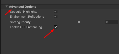 Так же давайте поговорим про материалы. По ним у нас на канале уже есть подробная статья. Следует не забывать по возможности применять к нескольким объектам 1 и тот же материал. Это значительно поможет ускорить отрисовку всех объектов и подарить пару лишних FPS. Так же не стоит включить в материале специальную логическую переменную чтобы все материалы отрисовывались напрямую графическим ядром, а не проходили сперва через ЦП. Данную функцию можно включить в Стандарте/URP/HDRP, находится она напрямую на материале, вот тут: