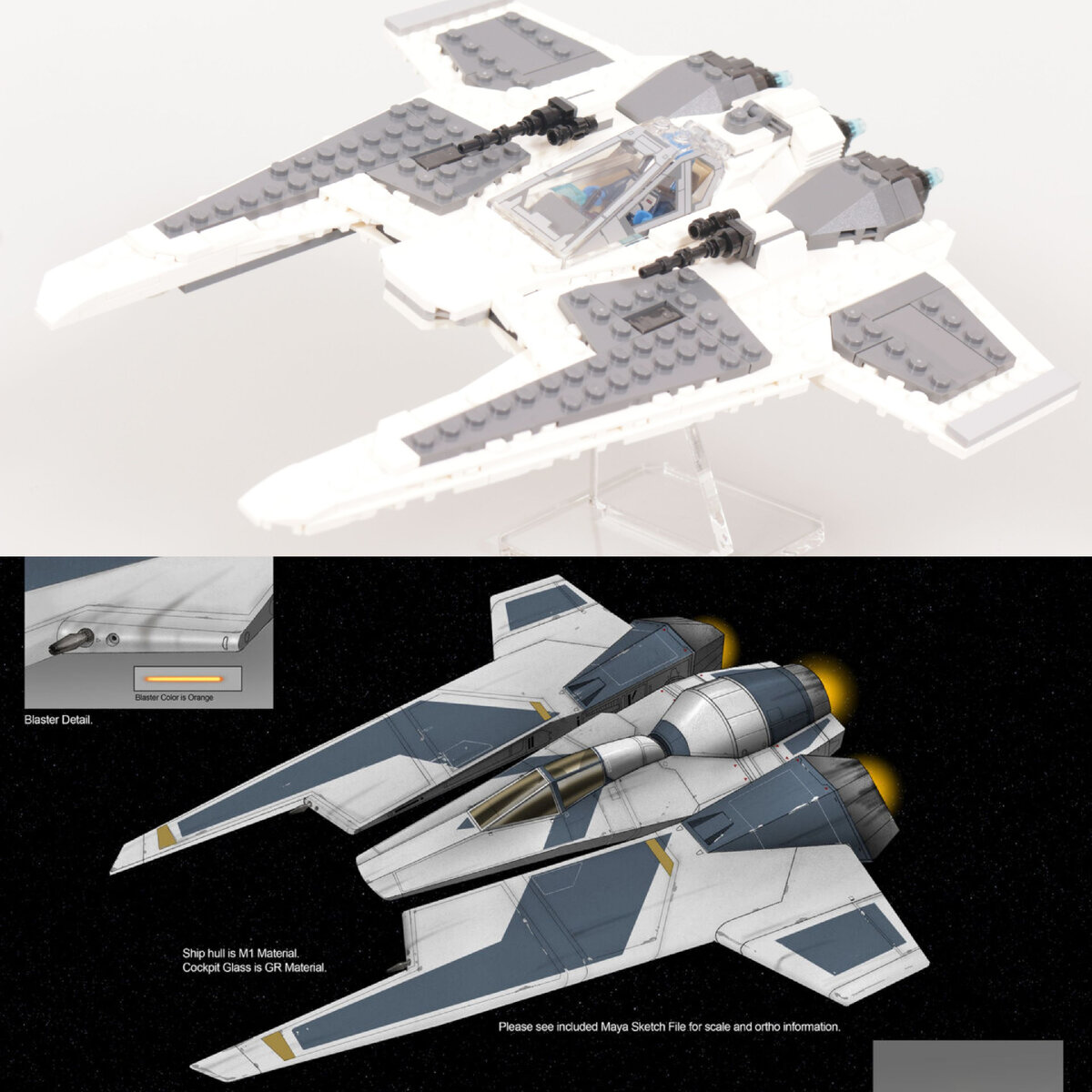 Введение Ниже представлен небольшой разбор истребителя типа "Клык" из набора 75348. К сожалению, интернет подкачал с качественными изображениеми мандалорского истребителя из "Мандалорца", поэтому придется пользоваться наработками по "Повстанцам". Внешний вид Расцветка сильно напоминает вариант из "Повстанцев", но в бело-серой окраске. Не хватает элементов темно-желтого цвета, но тут не поспоришь, т.к. нет оригинала из "Мандалорца". Рисунок в таком масштабе идеально повторить не получилось, но в целом мне нравится то, как это сделано с помощью серых деталей "крыла". Тут же хочется отметить, что геометрия серой детали двигателя будто позаимствована у оригинала. Единственное, что её бы поделить напополам и станет, как в "Повстанцах". Еще одним плюсом набора является детализация низа истребителя. Хотя тут все гораздо проще и "рисунок" далек от оригинала, но все же хорошо, что над этим стали работать. Движки все-таки напоминают версию из сериала. Тут главное отличие в центральном из них. Со