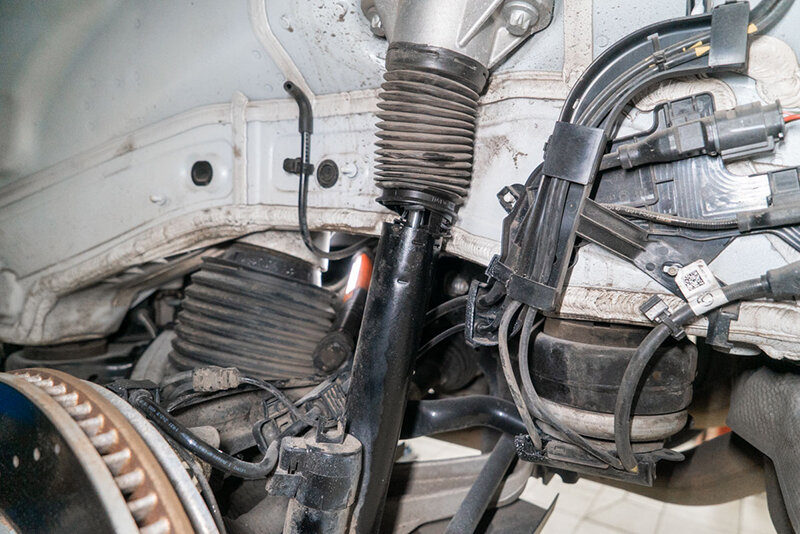 В нашем техническом центре выполняются различные виды работ по обслуживанию и ремонту ходовой части Mercedes. В этот раз к нам обратился владелец премиального Mercedes W167 GLE 63 AMG для устранения неисправностей задней подвески. В процессе поездки по бездорожью произошло повреждение нескольких элементов задней ходовой части автомобиля: был поврежден задний левый амортизатор, погнуты левый поперечный и левый продольный рычаги. Нашим специалистам предстояло выполнить необходимые ремонтные работы и, по возможности, сэкономить средства автовладельца. По итогам диагностики было принято решение произвести замену поперечного рычага и амортизатора, выполнить демонтаж продольного рычага и после восстановления установить его на место. В процессе ремонта применялись преимущественно оригинальные расходники подвески Mercedes, которые клиент привез с собой. Начинаем выполнение работ с демонтажа левого поперечного верхнего рычага задней подвески. Рычаг был сильно деформирован и не подлежал восстано