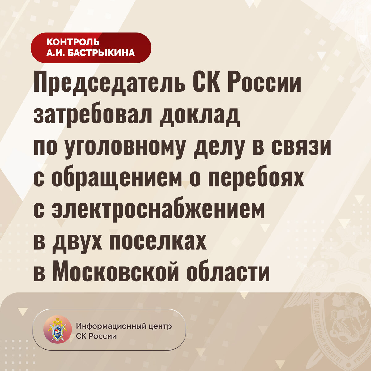 Председатель СК России затребовал доклад по уголовному делу в связи с обращением о перебоях с электроснабжением в двух поселках в Московской области