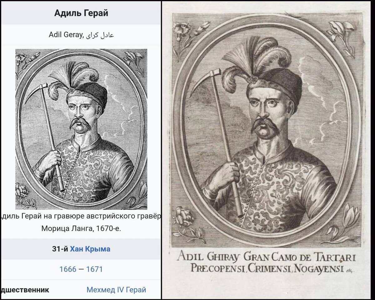 Как показывает практика, некоторые любители истории до сих пор воспринимают такой ресурс , как Википедия, за источник объективной информации. Они, в принципе, в курсе, что этот ресурс доступен любому желающему и позволяет редактировать страницы, внося в текст, все, что вздумается – и такое уже не единожды отмечалось, чего стоит только случай, когда китайская домохозяйка от скуки 10 лет в китайской версии этого ресурса писала выдуманную историю России. Тем не менее, в дискуссиях часто можно столкнуться с ссылками на данный ресурс как на объективный источник. На самом деле, Википедия обычный информационный механизм, который используется в том числе и для распространения, нередко сознательного, недостоверных сведений. Продемонстрировать это можно, в частности, на таком примере. В Википедии можно найти информацию о крымском хане Адиль Гирее с изображением его портрета, взятого с гравюры 17 века. Все бы ничего, но если посмотреть на саму гравюру, сразу бросается в глаза, что портрет хана о