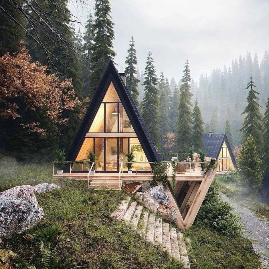Дома треугольной формы строятся по каркасной технологии. Двускатная кровля начинается от фундамента и выполняет роль стен. Такие постройки в основном имеют дачный или кемпинговый вид. Авторство идеи таких проектов принадлежит австрийцу Рудольфу Шиндлеру, который в 30-х годах прошлого века объявил о своей революционной идее — доме, где крыша стала стенами. Но постройки в форме шалаша имеют древние корни. Вспомним, например, вигвамы индейцев или юрты северных кочевых народов. Особую популярность в 50-х годах приобрел дизайнерский дом-шалаш Leisure House из фанеры с белоснежными интерьерами внутри. Это послевоенное экономичное решение «сделай сам», когда готовый привезенный домокомплект собирался по планам. Чем не идеальная привозная дача? После пика популярности в 60-е годы на западе привлекательность этих домов резко упала. Теперь с модой на эко-стиль возвращается интерес к таким необычным постройкам. Посмотрите, как идеально такие проекты вписываются в окружающую природу.