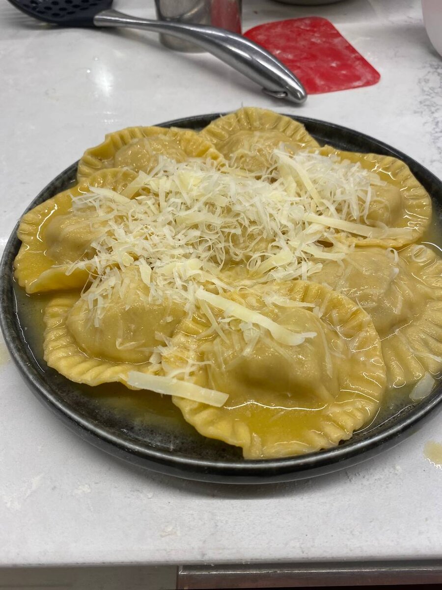 Всем, привет. В воскресенье в кулинарной школе Novikov School у нас была тема пельмени. Учились готовить тесто для пельменей, равиоли и соответственно лепить, а также готовили гёдза - это такие японские пельмешки. Равиоли с белыми грибами Сначала подготовили начинку. Белые грибы размороженные режем мелким кубиком. Чеснок режем прям очень мелко. Сначала приготовим загуститель, на растопленном сливочном масле обжариваем муку для получения такой густой смеси. Затем грибы обжариваем до золотистого цвета с добавлением веточки тимьяна, если грибы вдруг начнут выстреливать (выпрыгивать) со сковородки сделайте поменьше нагрев. Тимьян убираем. Добавляем чеснок, обжариваем минуту. Чеснок не положили сразу, потому что он начнет гореть и даст горечь. Добавляем соль, перец. Вливаем сливки и готовим до кипения. Затем загущаем той самой мукой со сливочным маслом, прям хорошо помешивая лопаткой по всей площади сковородки. Получится довольно густая грибная смесь. Пока она охлаждается можно заняться тес