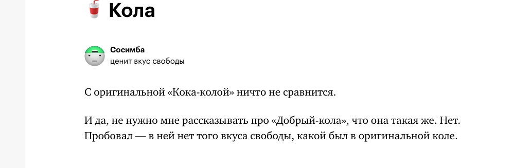 Вот вы знали, что у колы – вкус свободы? Если нет, теперь знаете и нет, не благодарите, я просто так, от широты душевной эту информацию принес, не ожидая благодарности. Просто как увидел такое высказывание, так подвис, пытаясь понять – шутит человек аль на самом деле, сей вкус в ней учуял? А если учуял, то почему именно в коле? Понимаете ли, я вырос в стране «победившего тоталитаризма». По мнению нынешней молодежи, я ночами плакал под одеялом от отсутствия жвачки и вкусной газировки (вернее, колы). Не видел конфет, а вместо пирожного употреблял исключительно хлеб с маслом, посыпанным сахаром. Хотя нет, не с маслом, разумеется, с маргарином. Но вот в чем фишечка… Несмотря на то, что хлеб с маслом и сахаром на самом деле ел (удобный перекус), а еще извращался бутербродом из черного хлеба с вареньем из черной же смородины, никогда не тосковал по коле и жвачкам. Открою большой секрет: они у меня были. Ну да, вместо кока-колы была пепси-кола, а если не было ее – лимонады, список названий