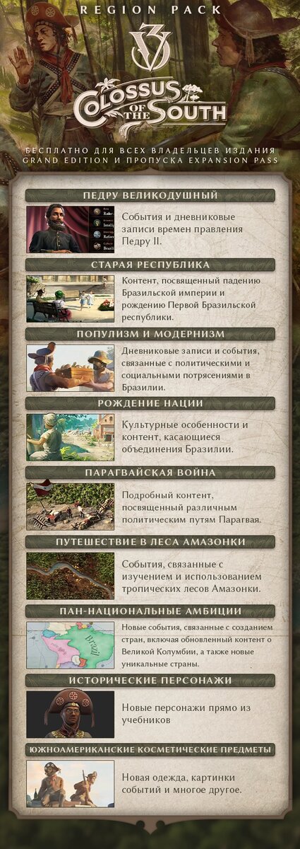 Глобальная стратегия Victoria 3 получила крупное контентное дополнение Colossus of the South, которое добавляет в основную игру исторические события Бразилии и Южной Америки в целом. “Южная Америка с ее огромным населением, богатой культурой и множеством ресурсов подошла к Викторианской эпохе во всеоружии. Но эти страны, только что освободившиеся от ига Европы, ждет множество проблем. Сделайте ставку на будущее Южного полушария в Colossus of the South, новом пакете регионов для Victoria 3”. Судя по отзывам в “Стиме”, игрокам понравился “Колосc Юга”. У дополнения 84% одобрения геймеров. https://youtu.be/Zq9-HM0bkf4