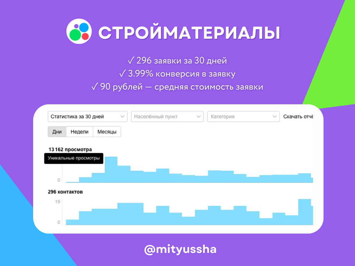 Описание: Компания занимается продажей газоблоков и пораблоков по Москве и области. Ранее слышали о том, что конкуренты получают заявки на покупку стройматериалов, но не могли найти грамотного специалиста. Задача: Начать получать заявки на покупку стройматериалов через Авито Рекламный бюджет в Авито: 30 000 р Цель: Получить наиболее целевые заявки на покупку газоблоков и пораблоков Что было сделано: