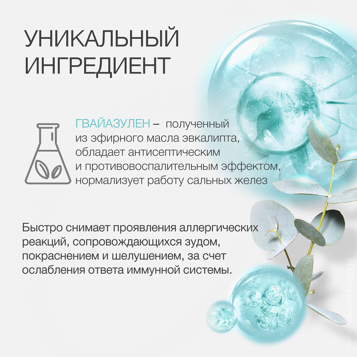 🤍Когда мы говорим азулен, то подразумеваем комфорт, а когда мы говорим комфорт, то сразу рука сразу тянется к успокаивающим препаратам из линии IDRACALM от ELDAN Cosmetics. 🧪В средствах серии содержится особо эффективная форма – гвайазулен, полученный из эфирного масла эвкалипта, который обладает антисептическим и противовоспалительным эффектом, нормализует работу сальных желез, способствует устранению жирного блеска, борется с акне. Гвайазулен быстро снимает проявления аллергических реакций, сопровождающихся зудом, покраснением и шелушением, за счет ослабления ответа иммунной системы, в результате уменьшаются отёк и покраснение. 💦Азуленовый очищающий гель с легкой текстурой и приятным ароматом для бережного умывания, подходит для всех возрастов и типов кожи, даже для самой чувствительной и/или поврежденной. Имеет богатый ингредиентный состав: эсцин из семян конского каштана укрепляет стенку капилляров, экстракты календулы, иглицы понтийской, центеллы азиатской, коры дуба придают ср