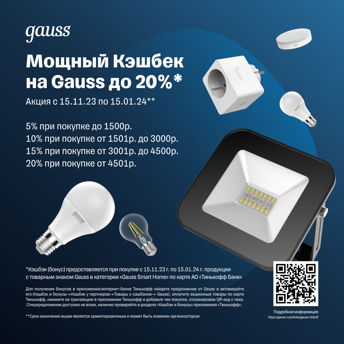 Бренд Gauss и Тинькофф Банк продлевают совместную акцию: "Мощный Кэшбэк до 20%" Кэшбэк (бонус) предоставляется при покупке с с 15.11.2023 г по 15.01.2024 г продукции с товарным знаком Gauss в категории «Gauss Smart Home» по карте АО «Тинькофф Банк»*. Наши покупатели получают уникальную возможность существенно сэкономить на товарах любимого бренда. В рамках совместной акции предоставляется мощный кэшбэк до 20% от суммы покупки – это идеальный шанс насладиться качественными товарами по выгодным ценам. Акция распространяется на товары бренда Gauss в категории «Gauss Smart Home», что делает ее особенно привлекательной для поклонников современных технологий и решений для “умного” дома. Акция действует при покупке в любом онлайн- или офлайн-магазине наших партнеров по всей стране, кроме маркетплейсов Ozon, Wildberries, "Яндекс Маркет", "Мегамаркет". Оплатите покупку картой от банка Тинькофф и получайте кэшбэк от суммарной стоимости товаров Gauss в чеке согласно следующим условиям: Не упустит
