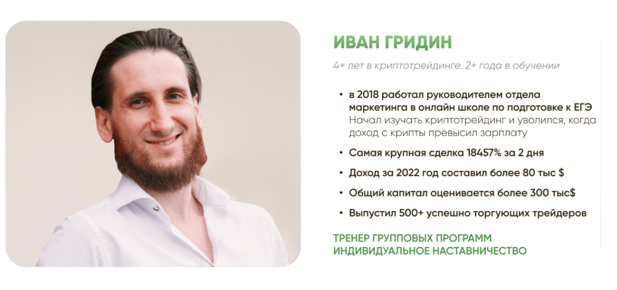 Иван Гридин в крипто трейдинге уже более 4 лет. В 2022 году заработал более 80 тысяч долларов, а самая результативная сделка дала 18 457% профита за два дня. Иван выпустил более 500 учеников, успешно практикующих трейдинг для заработка.