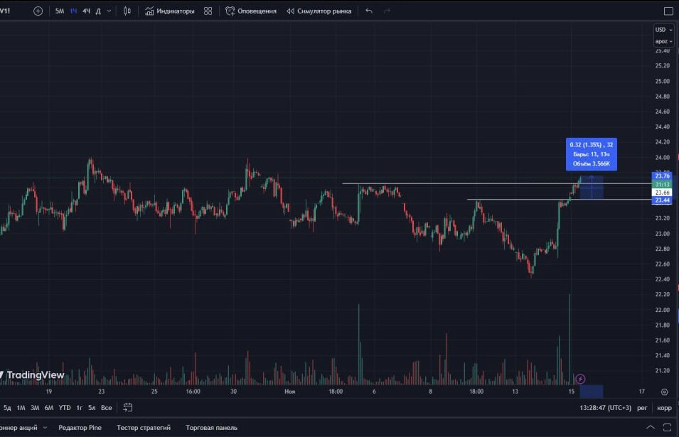Глобальна картина. Актив находился в длительной фазу накопления (проторговке), после чего показал нисходящее движение, забрав большую часть ликвидности в шорт. Однако вчера, ближе к закрытию основной торговой сессии, в актив зашли объемы, и вернули цену в торгуемый ранее диапазон, сформировав каскад «хаев». Идея сделки: пробой хаев. Причины/условия: четкий уровень (+снятая ранее ликвидность), наличие участника (повышение объемов + крупные плотности в покупку в стакане), наличие активности. так же похожий рост показывал смежный актив (золото) ТВ: 23.45 СЛ: выход при разъедание плотностей покупателя ТП1: 23.60 ТП2: 23.65 ТП3: 23.70 Отработка Локальная картина Вход выполнен хорошо, после легкого пролива, сразу перед плотностью продавца, который далее стал выталкивать цену. При пробое началась активность в ленте. Сделку удерживал по плану. Выход выполнен нормально, при исчезновении плотности крупного покупателя, которая была моим СЛ. Однако как видно по графику, цена технично схо