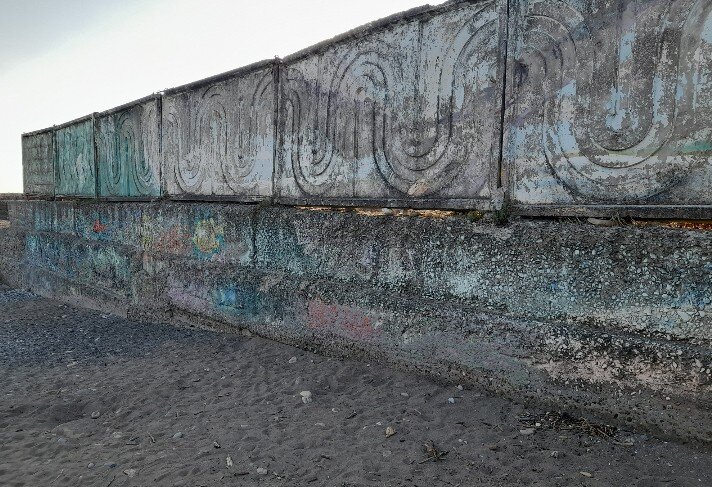 Добрый день, Друзья! Нам повезло - нам доверили роспись огромной стены в пансионате «Бургас», в Адлере в курортном городке. Стена находится по дороге к пляжу на территории пансионата. Она была в ужасном состоянии: потрескавшаяся старая краска, пыль, грязь, мох. Нам пришлось полностью зачистить её щетками. Потом, как обычно, мы покрыли стену грунтом глубокого проникновения Церезит. Далее мы использовали обычную фасадную краску и сверху дорисовывали аэрозольной краской Артон. Гарантия на рисунок по договору с «Бургасом» была всего лишь 6 месяцев. Бюджет был ограничен, в него даже не входила подготовка стены под рисунок и зачистка, мы делали эти работы за свой счет. Работы проводили в августе 2023 в жару +35. Если честно, то это был подвиг! К счастью, море совсем рядом, и мы постоянно остужались в нём. Макет полностью разработан нами, но на деле рисунок прилично отличался от макета. Самое интересное! Мы наняли 2-х дизайнеров на разработку макета, но их варианты не устроили заказчик