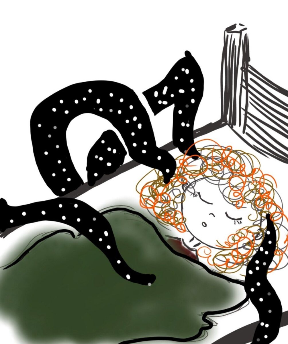 По комнате ползла странная чернота. Она спускалась по стенам и тихо двигалась по полу. Из нее появились щупальца и окружили кроватку на которой спала рыжая девочка. Вдруг она дернулась, а черные щупальца уползли в темноту.