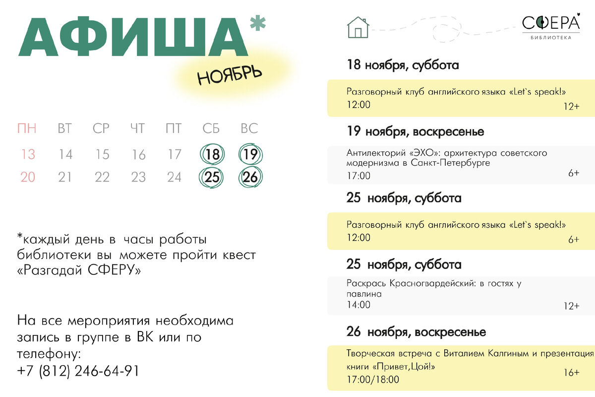 26 ноября 2023 года, в Санкт-Петербурге, в помещении библиотеки "Сфера" состоится творческая встреча с автором многих книг о творчестве группе "КИНО" - Виталием Калгиным. Виктор Цой - одна из самых известных и ключевых фигур отечественной рок-музыки, фронтмен знаменитой ленинградской рок-группы "КИНО". С момента трагической гибели музыканта прошло более 30 лет, но его музыка и тексты по-прежнему остаются "тем самым лучом уже давно погасшей звезды, чье тепло до сих пор согревает всех нас..." Как жил и творил «последний герой» русского рока? Что ему писали многочисленные фанаты, отвечал ли он им? На встрече с Виталием Калгиным вас ждут новые факты из личной и творческой биографии Виктора Цоя. Поклонники рок-музыки, не пропустите! Итак: 26 ноября 2023 года, библиотека "Сфера" - Санкт-Петербург, ул. Лагоды, д. 7, стр. 1 (м. Ладожская), 17-18.00 Регистрация по ссылке: https://biblioteka-sfera.timepad.ru/event/2663533/ Регистрация по ссылке: https://biblioteka-sfera.timepad.r