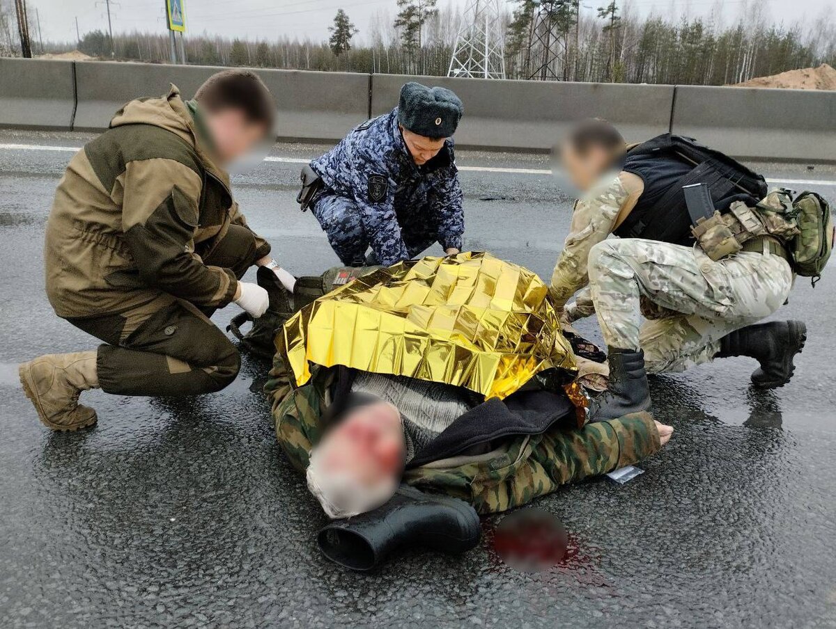 В Нижегородской области сотрудники ОМОН (на транспорте) «Ястреб» Управления Росгвардии по Нижегородской области и отдела вневедомственной охраны по Балахнинскому району, возвращаясь с полигона, стали свидетелями дорожно-транспортного происшествия, в котором пострадал мужчина. И получил множественные травмы. Двигаясь по автодороге Москва-Уфа в районе 383-го километра сотрудники вневедомственной охраны и командир взвода спецназа майор полиции Денис стали очевидцами дорожно-транспортного происшествия. Грузовой автомобиль, по предварительным данным, не справившись с управлением, сбил идущего по пешеходному переходу пожилого мужчину. Незамедлительно офицеры Росгвардии приняли решение об оказании помощи пострадавшему. Росгвардейцы отдела вневедомственной охраны старший прапорщик полиции Алексей Мареев, старшина полиции Сергей Кулагин и старшие сержанты полиции Дмитрий Солеев и Евгений Трошин оперативно перекрыли движение на проезжей части для оказания помощи. Фельдшер медицинской части транс