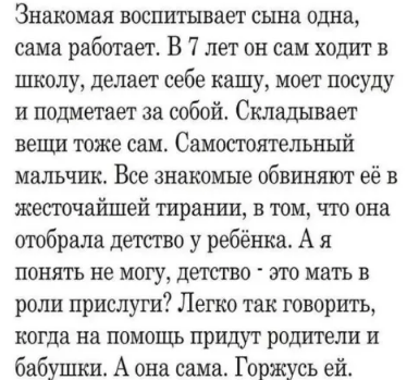 Геннадий Костарев У многих людей, к сожалению, весьма извращенное понимание "детства", как и не менее извращенное отношение к труду! Кому, как не детям необходимо прививать любовь к самому разнообразному, посильному для них труду?! И делать эту прививку надо как можно раньше, но не насилуя волю ребёнка, делая это радостно, в занимательной форме своеобразной игры. Ибо, в противном случае, формируется с ранних лет пренебрежительное отношение к труду как таковому, но особенно неуважительное отношение к так называемому "грязному" труду, и как следствие, и к тем людям, которые в любом случае вынуждены этим трудом заниматься, так как необходимо кому-то выполнять эту работу, пусть и совсем не престижную. Разве не приятно наблюдать, когда кто-то проявляет свою отзывчивость и чуткость в своем стремлении прийти кому-то на помощь не корысти ради, но по зову неравнодушного сердца? Насколько бы мир земной стал Светлее и добрее при таком отношении людей друг к другу! Но, могут ли воспита
