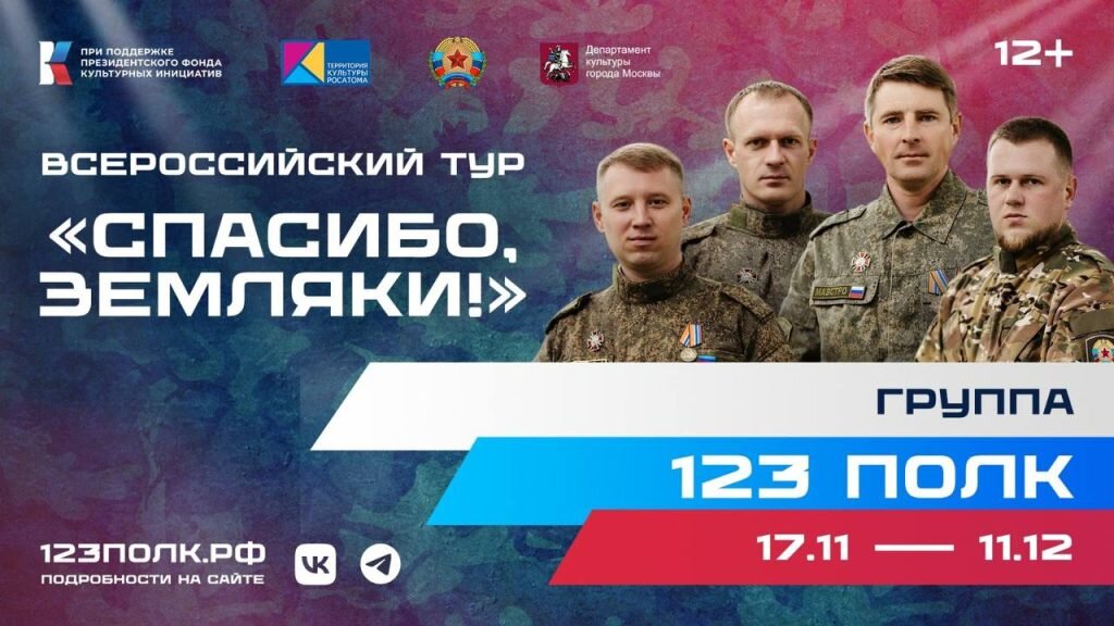 Всероссийский концертный тур музыкальной группы “123 полк”, в состав которой вошли артисты Луганской филармонии, ушедшие на фронт по зову сердца и проходившие службу в 123-м полку Народной Милиции, начинается 17 ноября.