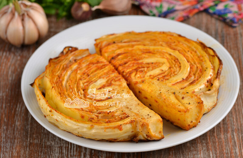 7. До полной готовности капусту не запекаем, иначе она станет сухой. Боковые листья слегка подгорят, убираем их. Капуста останется сочной и слегка хрустящей. Если хотим, чтобы капуста получилась очень мягкой, то перед тем, как дополнить ее специями, отвариваем в воде, а затем добавляем специи, масло и запекаем.