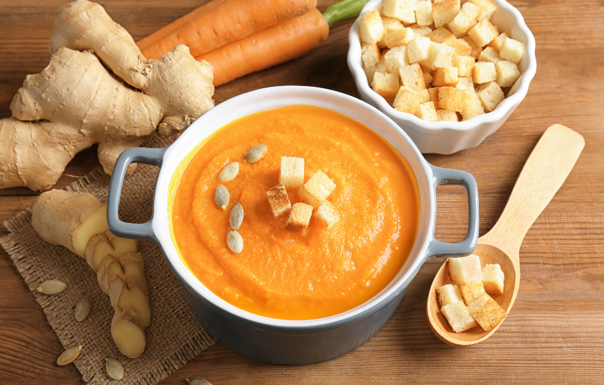 Erid: 2SDnje1Pf1S В холодную осеннюю пору особенно хочется чего-то уютного. И речь не только про пледы и мягкие тапочки. Еда тоже может дарить тепло и согревать душу. Например, ароматный горячий суп. Своими цветом и вкусом он сделает день чуточку теплее. Попробуйте, вам обязательно понравится! А покупая ингредиенты, не забудьте воспользоваться промокодом ДЗЕН20 на сайте auchan.ru или в мобильном приложении «Мой АШАН» и получить скидку 20%*. *Промокод действует до 30.11.2023 только на один заказ от 2500 руб. Для приготовления вам понадобятся: морковь — 5 шт.; тыква — 500 г; кокосовое молоко — 400 г; консервированная белая фасоль — 450 г; оливковое масло — 3 ст. л.; зеленый лук — 2 пера; свежий имбирь — 2 ст. л.; чеснок — 2 зубчика; семечки тыквы — для украшения; хлеб — 2 ломтика; соль, перец — по вкусу. Из такого количества ингредиентов получится 4 порции. Шаг 1 Подготовьте ингредиенты. Натрите имбирь и чеснок, от зеленого лука отрежьте белую часть и нашинкуйте ее. Морковь и тыкву наре