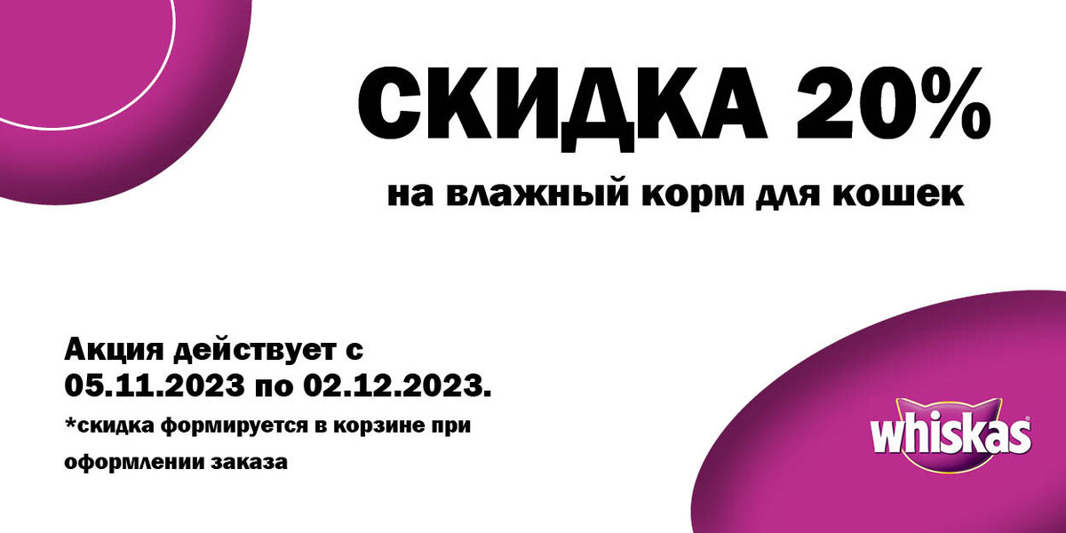 АКЦИЯ WHISKAS -20% СКИДКА НА ВЛАЖНЫЙ КОРМ ДЛЯ КОШЕК, НОЯБРЬ!