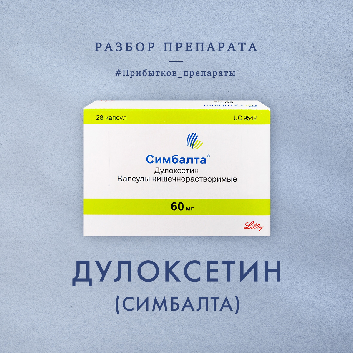 Дулоксетин (симбалта) – антидепрессант «двойного действия». Он влияет на серотонин и норадреналин – два нейромедиатора (вещества, регулирующие работу нервной системы). Относится к группе СИОЗСН (селективные ингибиторы обратного захвата серотонина и норадреналина). Есть данные, что слабо влияет на дофамин, повышая его активность Дулоксетин создан компанией Eli Lilly. Ранее они синтезировали флуоксетин, в США это был хит по продажам и результатам лечения (на тот момент в Америке других СИОЗС не было). Потом появились новые представители класса СИОЗС (золофт, паксил и др.). И подумали учёные мужи: а почему бы нам не создать новую молекулу, да такую, чтобы цепляла не только серотонин, но ещё и норадреналин (благо венлафаксин с подобным механизмом действия на тот момент уже существовал)? Сказано – сделано. Так родился новый антидепрессант, и назвали его дулоксетин. Жив-здоров он и в наше время, не то, чтобы в лидерах, но своё место застолбил. Что же мы о нём знаем? Дулоксетин официально ре