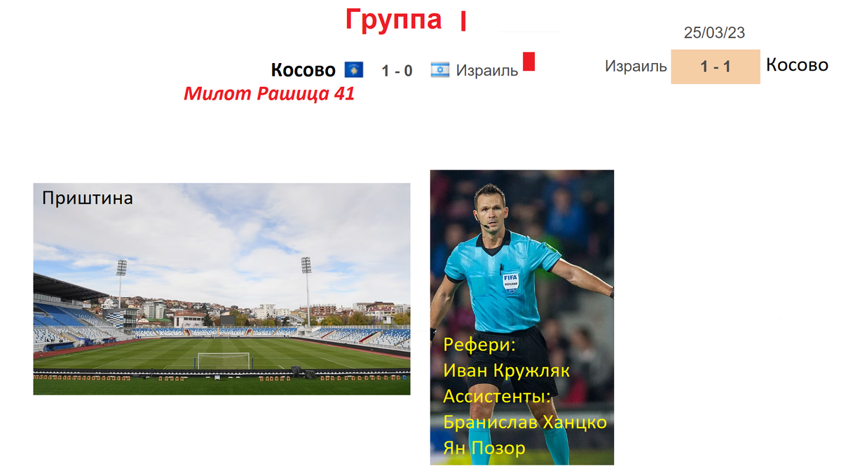Дорогие, друзья, этот обзор мы посвятим всего одной уникальной группе, где на этой неделе перенесённые матчи сыграла сборная Израиля. Будет он интересен тем, что в таблице сменился лидер. ........................................................................... Сборная Израиля выступала хорошо, пока не встретилась 12 ноября с Косово. «Сине-белые» прервали 4-х матчевую серию без поражений и уступили на Балканах с минимальным счётом 1-0. Сразу бросается в глаза удаление в составе гостей, но оно произошло на 95-й минуте, а единственный гол провёл под перерыв Милош Рашица, представляющий клуб «Бешикташ». Рассудили встречу арбитры из Словакии Иван Кружляк и два его ассистента Бранислав Ханцко и Ян Позор. Получается, израильтяне дважды не сумели переиграть Косово. Напомню, в первой игре, 25 марта, был зафиксирован ничейный счет 1-1. .................................................... Через 3 дня избранные Богом встретились во второй перенесённой игре со Швейцарией и вновь взяли очко (1-1)