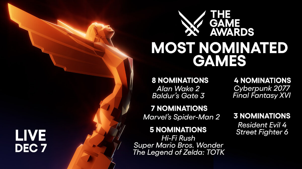 13 ноября Джефф Кили ведущий и продюсер The Game Awards 2023 провёл трансляцию, где объявил номинантов на премию. Среди участников больше всего номинаций у Baldur's Gate 3 и Alan Wake 2 (по восемь у каждой игры), после них идёт Marvel’s Spider-Man 2 претендующая на семь наград. Starfield представлена только в одной номинации, лучшая RPG. Полный список по номинациям: Игра года: Лучшая поддержка игры: Лучший арт: Лучший саундтрек и музыка: Лучшая поддержка сообщества: Лучшая инди-игра: Лучшая дебютная инди-игра: Лучший приключенческий экшен: Лучшая RPG: Лучший экшен: Лучшая работа геймдиректора: Лучший файтинг: Лучшая семейная игра: Лучший симулятор или стратегия: Лучшая спортивная или гоночная игра: Лучший нарратив: Лучший дизайн звука: Номинация Games for Impact — игры, затрагивающие социальные проблемы: Лучшая мобильная игра: Премия за инновации в области доступности для людей с ограниченными возможностями: Лучшая актёрская игра: Лучший мультиплеер: Лучшая адапта
