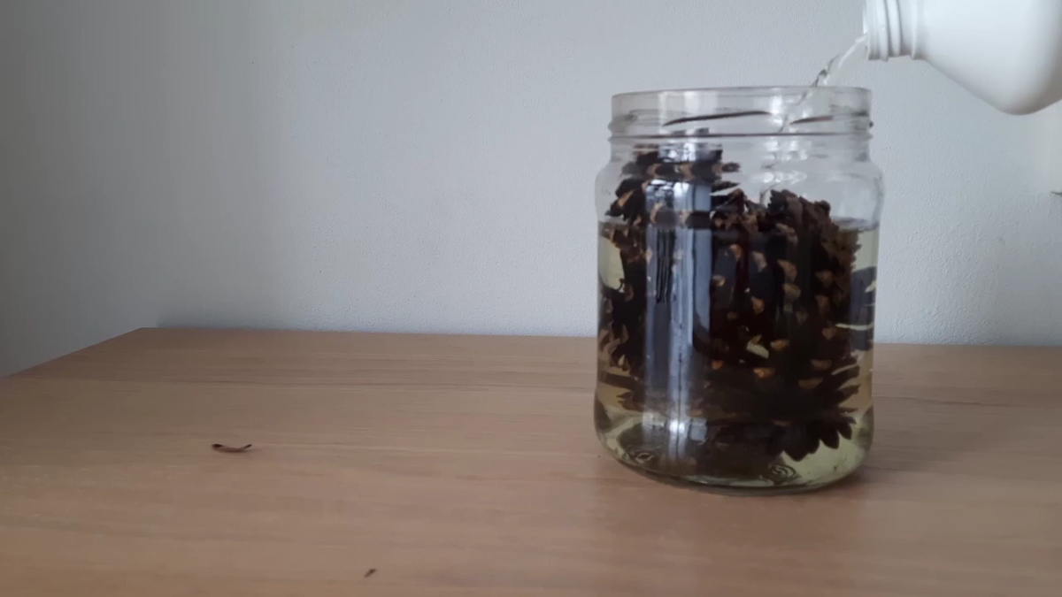 1. Шишки складываем в емкость и заливаем отбеливателем