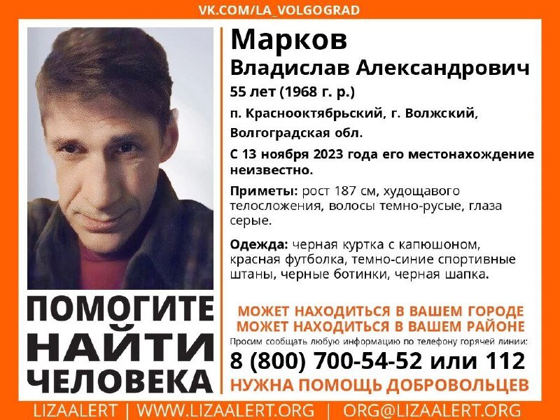 В Волгоградской области ищут 55-летнего Владислава Маркова. О поисках сообщил отряд «Лиза Алерт». Житель поселка Краснооктябрьского в Волжском исчез в понедельник 13 ноября, и с тех пор от него нет никаких известий. Мужчина очень высокий — около 187 см, худощавого телосложения, у него темно-русые волосы и серые глаза. В день исчезновения Владислав Марков был одет в черную куртку с капюшоном, красную футболку, темно-синие спортивные штаны, черные ботинки и черную шапку. Мужчину ищут волонтеры и полиция. Сообщается, что он может находиться в любом районе Волгоградской области или даже в другом городе, и для его поисков требуется помощь добровольцев. Ранее мы писали, что в Волгограде более четырех месяцев ищут пропавшего без вести 34-летнего уроженца областного центра Дмитрия Ястребова. Местонахождение молодого мужчины неизвестно с 28 июня. Как уточнили в поисковом отряде «Оберег. Волгоград», Дмитрий пропал, когда супруга с детьми отдыхали на море. Когда они вернулись, то не застали мужа