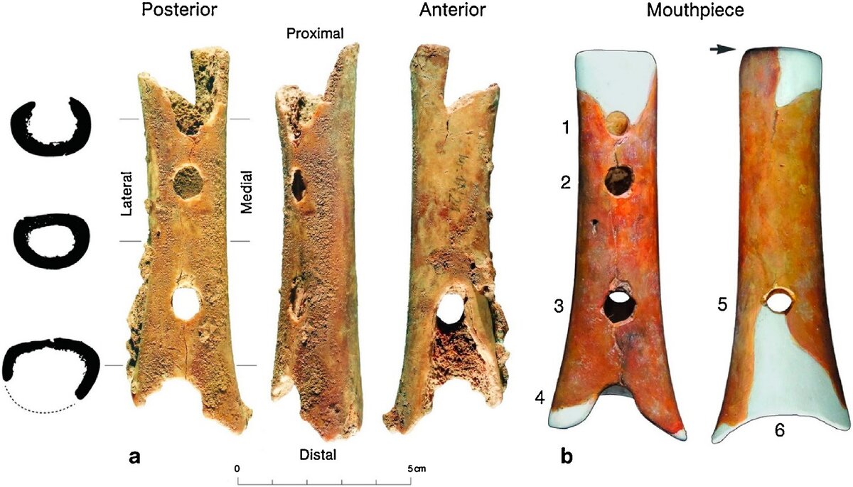 Древнейший музыкальный инструмент, который нашли ученые — это флейта, сделанная из кости медведя. Фрагмент флейты нашли в Словении, в местечке Дивье Бабе. Инструменту примерно 43 тысячи лет. Научные споры о флейте продолжаются до сих пор. Часть ученых приписывает ее неандертальцам, но другие исследователи считают, что у неандертальцев не было музыки, это особенность именно человека — существа с другим мозгом. А некоторые эксперты считают, что это вообще не инструмент, а просто прокушенная хищником кость.
