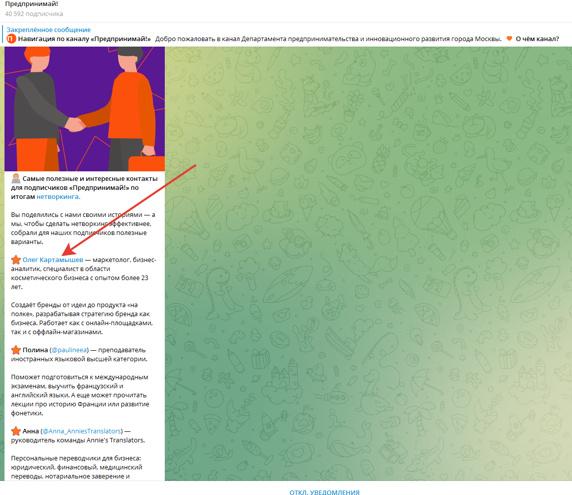Когда хорошо, тогда хорошо! Это моё строжайшее правило написания моих ежедневных аналитических постов по бизнес темам. Когда кто-то что-то сделал и получил хороший результат, достойный подражания, то я говорю «Господа предприниматели, проверено, мин нет, можно копировать». Когда же получен косячный результат, то я тут же предупреждаю «Ты туда не ходи, снег башка попадёт, совсем мёртвый будешь». Вот сегодня как раз о хорошем. 1. Есть какой ТГ канал «Предпринимай», который сам себя описывает следующим образом «Медиа про бизнес от Департамента предпринимательства и инновационного развития Москвы. Оперативно рассказываем обо всём, что важно и полезно московским предпринимателям». Аудитория канала более 40 тысяч подписчиков. 2. Недавно на канале был устроен проект нетворкинга, когда все желающие совершенно бесплатно разместили информацию о своей деятельности. Прошло некоторое время и сотрудники канала выбрали несколько предпринимателей, назвав их «полезные варианты». И среди этих «полезных