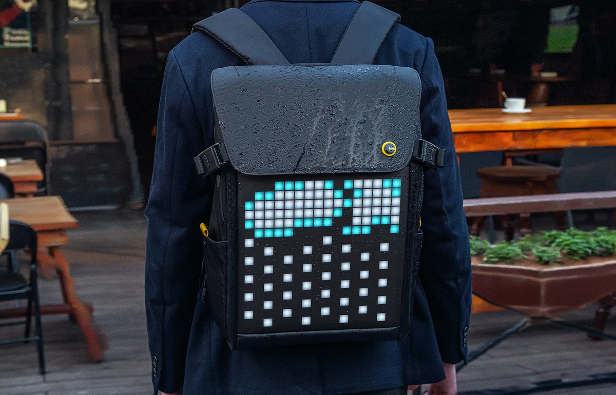 Рюкзак защищен от воды и вмещает средний 15-дюймовый ноутбук, а в отдельные отсеки можно сложить зарядку и другие школьные или рабочие пренадлежности. Но главная особенность — яркий пиксельный дисплей. Картинку можно выбрать в приложении, а можно создать самому. Есть как статичные изображения, так и анимированные. Для работы экранчика потребуется пауэрбанк на дне рюкзака.
