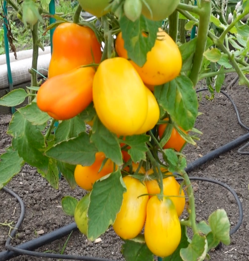 Кисти формируются гроздями, в которых от 6 до 10 плодов. Плоды удлиненные томаты-сливки ярко-оранжево-желтые с розовыми щечками при полном созревании. Масса плодов 50-80г.