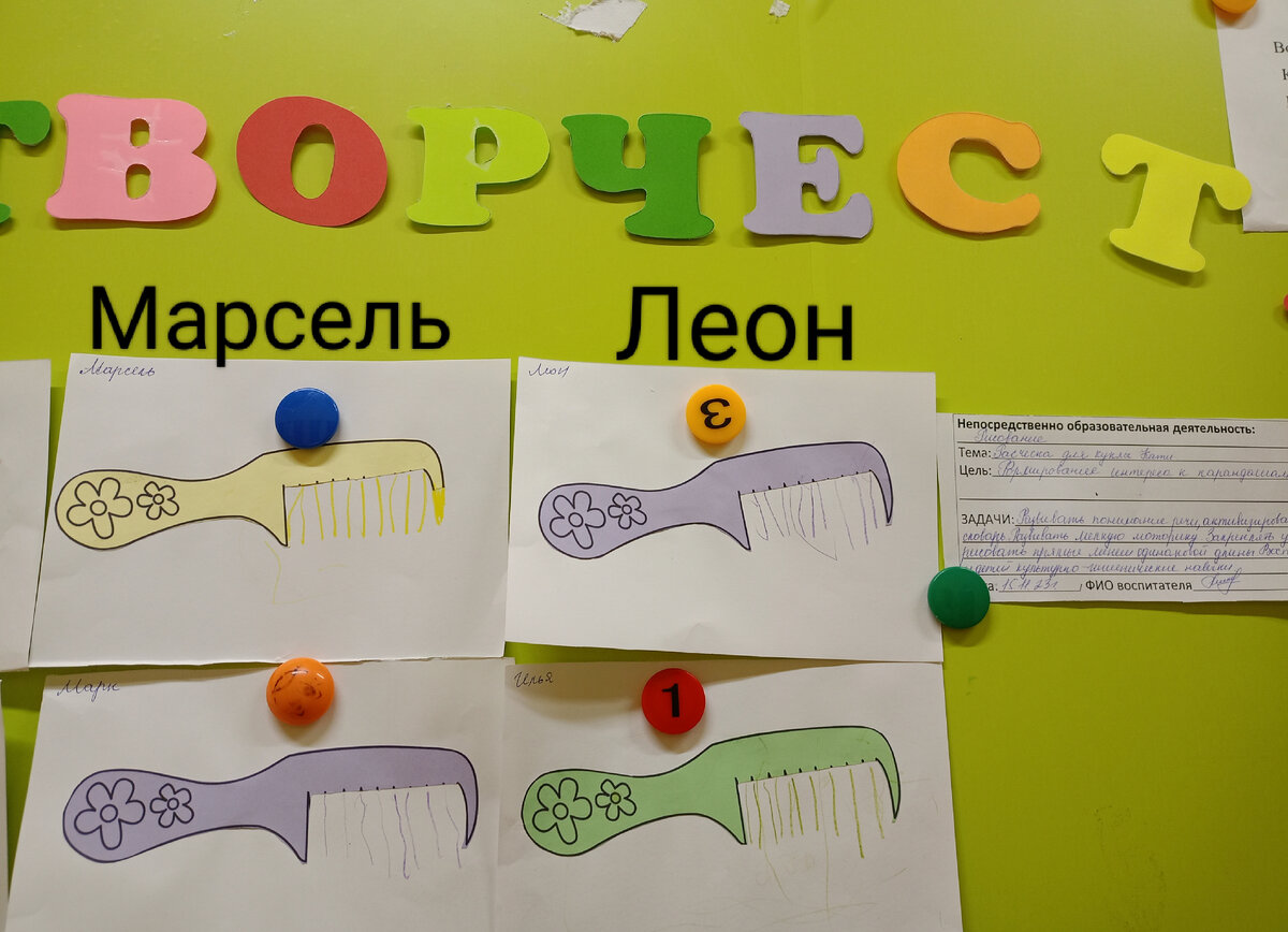 Удивительно, но сегодня проснулись мы по будильнику. Прежний наш будильник, Леон, был в глубоком сне, хоть старший брат уже смело громыхал на кухне. Видимо, погода сегодня сонная, да и настроение у мальчишек сегодня было какое-то мрачное. Несмотря на это, оделись мы спокойно, посадила их в коляски и начался вой. Инициатором был Марсель. Стало быть понял, что сад - это тебе не разовая акция, и хочешь-не хочешь - тебя не спрашивают. Зашли в раздевалку, тут нам сразу и Ксюха, и кричащая девочка Лиза. Ну и Леон наш составил Лизе компанию. А Марсель стоял млел от Ксюшки, которая гладила его по щёчке. На магнитной доске нас ждал сюрприз - первые творческие работы малышей! Рисовали зубчики к расческе. Конечно, не сами, но радует, что они участвуют в занятиях. Марсель скорее всего предпринял попытку съесть свою расческу. Вышла воспитатель, забрала наших пупсиков, в коридоре по пути истерикой в группу Леон обернулся, увидел,что дверь на свободу закрывается и снова включил сирену. Причём хо