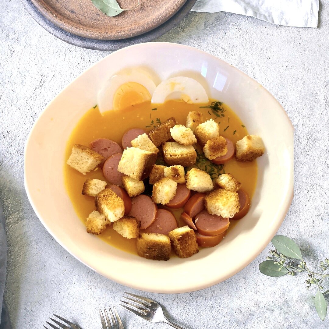 Готовим на обед тыквенный крем- суп с чесночными гренками и копченой колбаской