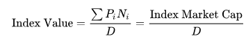 Фондовый индексвычисляется на основе цен (капитализации компаний) определённой группы ценных бумаг из «индексной корзины». Большинство современных фондовых индексов является взвешенным по рыночной капитализации. Например, в расчет американского фондового индекса S&P 500 входит 500 крупнейших по капитализации компаний США. Значение индекса равно суммарной (свободной) рыночной капитализации компаний корзины, поделённой на делитель. Рі — цена і-й акций в обращении для взвешивания по рыночной капитализации Ni — число акций в свободном обращении для взвешивания по свободной рыночной капитализации Делитель выбирается так, чтобы на момент исторического начала расчёта индекса (базовая дата) его значение равнялось какому-нибудь удобному числу (базовому значению); к примеру, для S&P 500 базовое значение равняется 10. В дальнейшем делитель изменяется для сохранения непрерывности значения индекса при корпоративных событиях. Например, для индекса S&P 500 2014 г. D=8921,33269716. Пользователю не ст