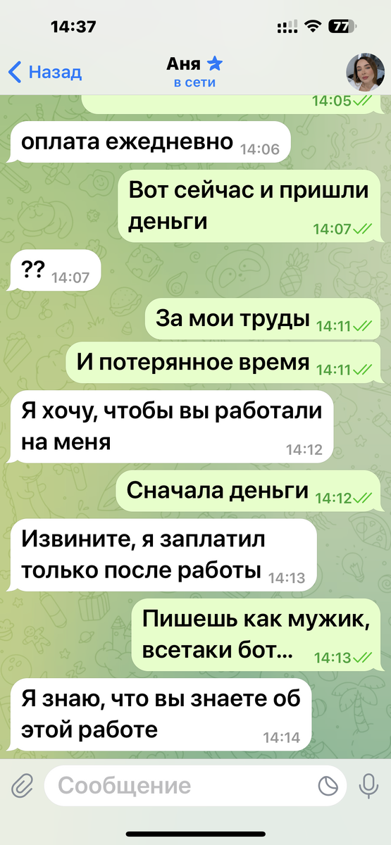 Сегодня расскажу, почему мне предложили и сколько готовы платить за участие в схеме по обману людей за поставленные лайки на отели, якобы для продвижения. Полностью раскрою , как используя подсадных уток(лохов), мошенникам удается развести людей на десятки, а то и сотни тысяч рублей (а кого-то и на миллионы), использую примитивную "жажду к халяве» Это середина моей эпопеи из трех частей. Про начало, вы узнайте в следующий раз, рекомендую обязательно прочитать всю трилогию, чтобы не потерять деньги. В первой части я расскажу, как мне удалось получить от мошенников 500 рублей, за свои "труды", и уже не в первый раз. Но сегодня речь пойдет о "работе", которую мне предложили интернет-мошенники, поняв, что развести меня не удастся и поэтому попытались притянуть меня на свою "темную строну" Раскусив аферистов, мне поступило предложение, так как в предыдущей схеме, где я тоже поучаствовал, присутствовали только боты, и я довольствовался только "зарплатой" в 300 рублей. А тут прямо реальный
