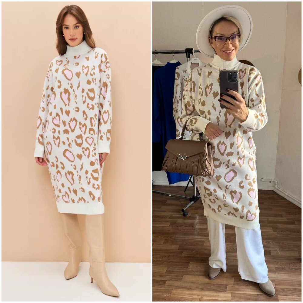 Здравствуйте, дорогие читатели! Меня зовут Ирина, я - стилист, и на этом канале показываю одежду и аксессуары с Wildberries такими, как они есть, то есть, из серии "ожидание/реальность". Мои параметры: рост 169 см, вес 62 кг, 95-75-100 ✅Основной канал: Стильно - не значит дорого! Ставьте лайк в поддержку канала, и давайте смотреть на мою сегодняшнюю покупку. Синее трикотажное платье - моя любовь с прошлого года, если вы помните, я вам его не раз показывала. Оно представлено у бренда в разных цветах, поэтому я не удержалась и заказала еще одно, только на этот раз с модным принтом. Не сомневалась ни минуты: модель отлично зарекомендовала себя в носке и, разумеется, синее платье я тоже продолжу носить в этом году. Оно теплое, с 50% шерсти, мягкое, из плотного трикотажа, который не скатывается. Очень удобное для осенне-зимнего периода. Можно проявить фантазию и надеть даже с трикотажными брюками, как я, но это уже на вкус и цвет. Платье достаточно свободное, представлено в едином размере 4