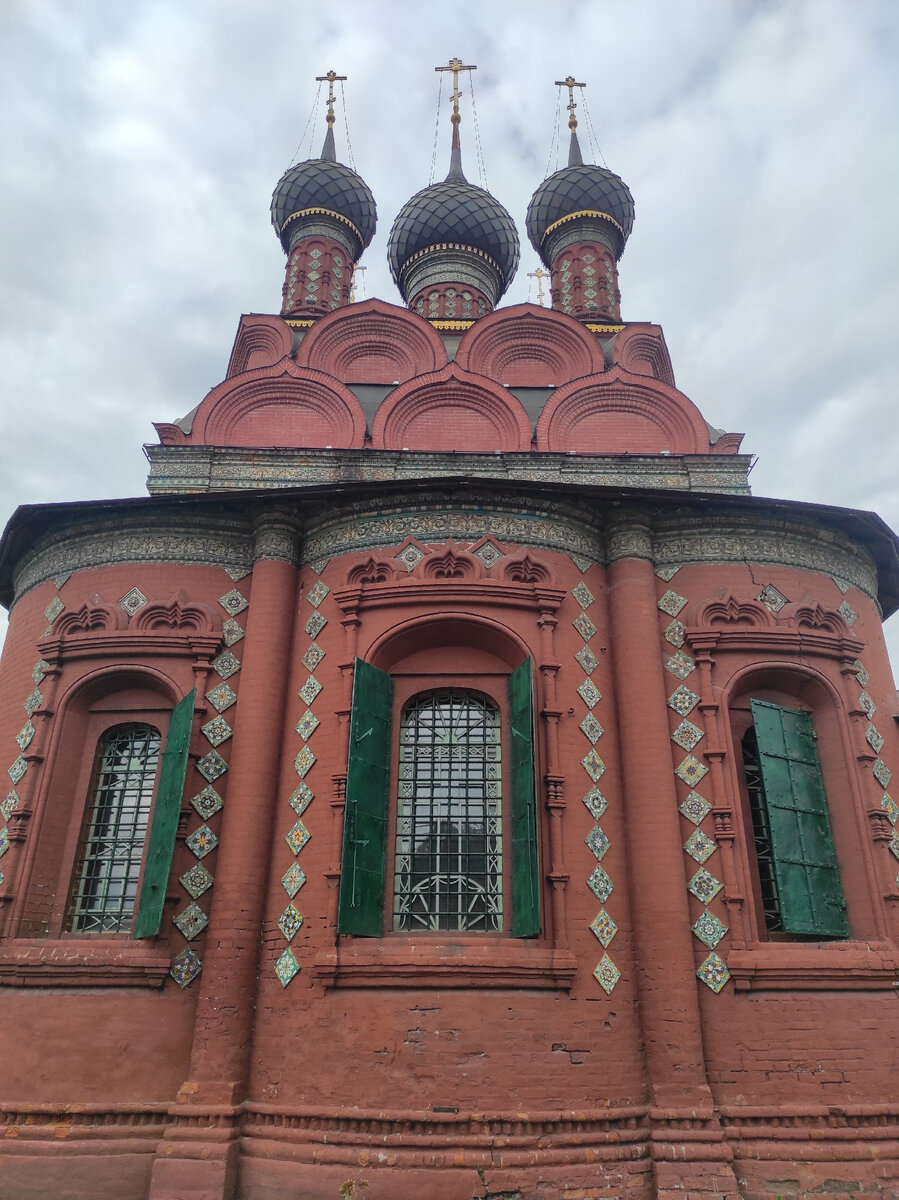 Церковь Богоявления в Ярославле для меня своего рода символ города. Из своей первой поездки в Ярославль я привезла именно этот образ типичной ярославской архитектуры. Небольшая нарядная церковь, совершенно изумительной красоты, покрытая сотней ярких изразцов, расположена в самом сердце города у стены Ярославского Кремля и берега реки Волги. К счастью в этот приезд церковь была открыта для посещения и полюбоваться я ею смогла не только снаружи, но и изнутри. Год основания церкви – 1684. Строительство длилось 9 лет. Возведена церковь была на средства купца Алексея Зубчанинова. Храм уникален своим архитектурным решением. Он бесстолпный, то есть внутреннее пространство свободно, нет никаких опорных конструкций (столбов, колонн) в центре помещения, только стены по периметру и над стенами свод (выпуклая крыша). Большие окна создают много объема и пространства, наполняют церковь большим количеством света. Храм стоит буквально на земле, те на фундаменте, нет привычного подклета. Снаружи