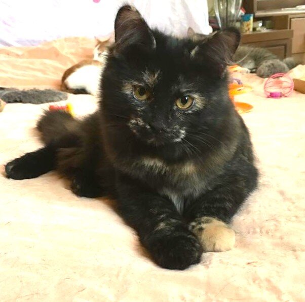 Мурёна – добродушная, в меру пушистая, очаровательная маленькая трехцветная кошечка с золотой лапкой. Когда Мурёну нежно гладишь — то в ответ она выдаёт настоящий Мурчалкин Блюз и вот ты её уже даже и не гладишь, а она всё напевает и напевает свою убаюкивающую песенку! Поэтому она – Мурёна! Кисонька очень доверчивая и спокойная, ласковая и нежная, идет навстречу, трется, радуется! Любит весело побегать с сестричкой и поиграть с мышками и шариками и валится от усталости там, где её застала дрёма. Мурёна пока еще растёт и требует дополнительного внимания и сбалансированного питания, но в еде она не прихотлива, кушает и вареную курочку и сухой корм Пурина Проплан Киттен с индейкой или Роял Канин для котят до 12 мес. Проглистогонена 2 раза, помыта с зоошампунем в Груминг центре, обработана от паразитов, но пока еще не привита. К лотку с бентонитовым комкующимся наполнителем приучена на отлично, всё старательно закапывает. Мурёна очень хочет найти уютный дом и заботливые руки. Так как она е