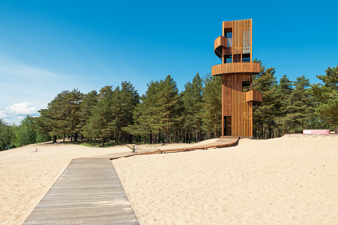 Первая остановка через два часа от старта, размять немного ноги и детей - Сясьстрой, городской пляж на высоком берегу реки Сясь. Его недавно благоустроили, построили интересную смотровую башню, детские и спортивные площадки, установили кабинки для переодевания, скамейки, качели, деревянные дорожки. Плюс ко всему этому огромное количество чистого и мелкого песка.