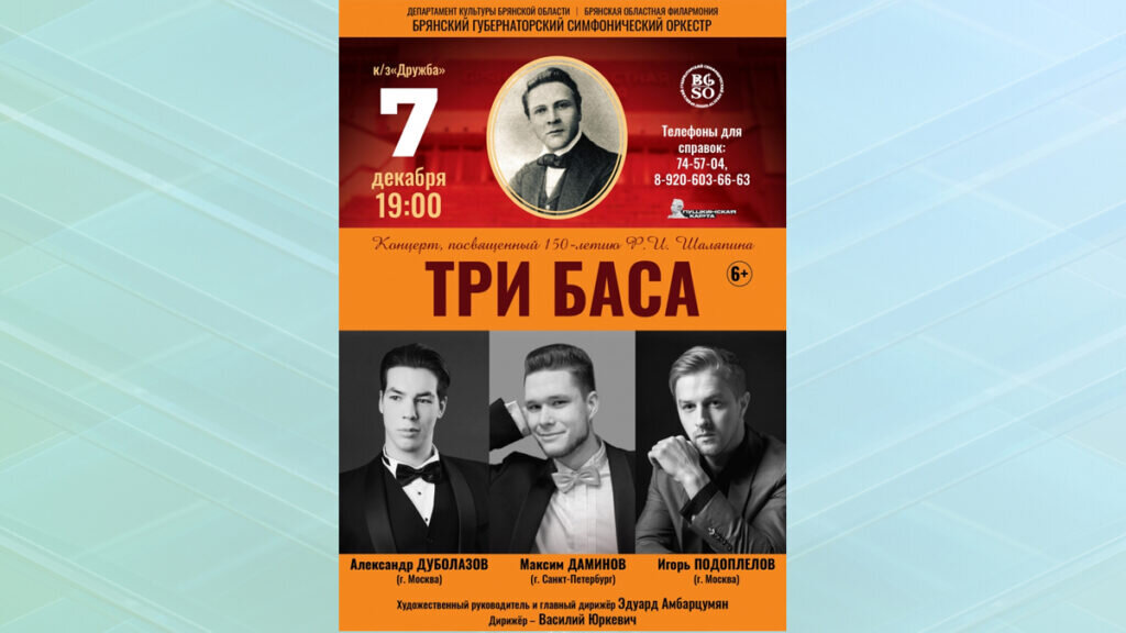 В этом году музыкальный мир отмечает 150-летие со дня рождения Федора Шаляпина — великого русского баса, покорившего слушателей всего мира уникальным голосом, невероятной силой эмоций и ярким артистическим дарованием. 7 декабря Брянск станет одним из главных центров юбилейных торжеств в честь великого певца. На сцене концертного зала «Дружба» состоится концерт «Три баса», с участием Брянского Губернаторского симфонического оркестра художественный руководитель и главный дирижер заслуженный артист России Эдуард Амбарцумян и солистов — лауреатов международных конкурсов Игоря Подоплелова, Александра Дуболазова и Максима Даминова. Начало в 19 часов. Впервые на брянской сцене в сопровождении симфонического оркестра выступят сразу три баса. Потрясающие вокалисты из Москвы и Санкт-Петербурга, лауреаты всероссийских и международных конкурсов Игорь Подоплелов (приглашённый солист Большого театра), Александр Дуболазов (финалист 1го Международного конкурса им. Ф.И. Шаляпина 2023 г. Санкт-Петербург