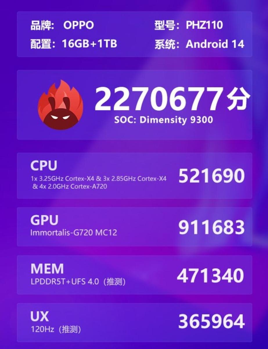 Новая линейка смартфонов OPPO серии Find X7 готовится выйти на рынок, и одно из будущих устройств этой серии уже было замечено в тесте AnTuTu, что еще раз подтверждает его скорый запуск. Смартфон OPPO Find X7, имеющий номер модели «PHZ110», успешно прошел тест AnTuTu и набрал общий балл в 2270677. Более подробные данные показали, что процессор, графический ускоритель, оперативная память и пользовательский интерфейс получили оценки в 521690, 911683, 471340 и 365964 соответственно. В базе данных также указан вариант смартфона с объемом оперативной памяти в 16 ГБ, а встроенной памяти емкостью 1 ТБ. Устройство будет оснащено чипсетом MediaTek Dimensity 9300, который уже официально подтвержден для данной модели. Отметим также, что смартфон будет поставляться с операционной системой Android 14 и будет совместим с оперативной памятью типа LPDDR5T и накопителем UFS 4.0. Его графический ускоритель Immortalis-G720 MC12 поддерживает частоту обновления экрана до 120 Гц. Ранее в базе данных Geekben