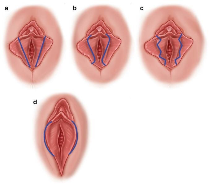 Функционально, если избыток ткани может быть удален без повреждения важных структур, может быть выполнена лабиопластика, которая также может быть адаптирована к эстетическим пожеланиям пациента.