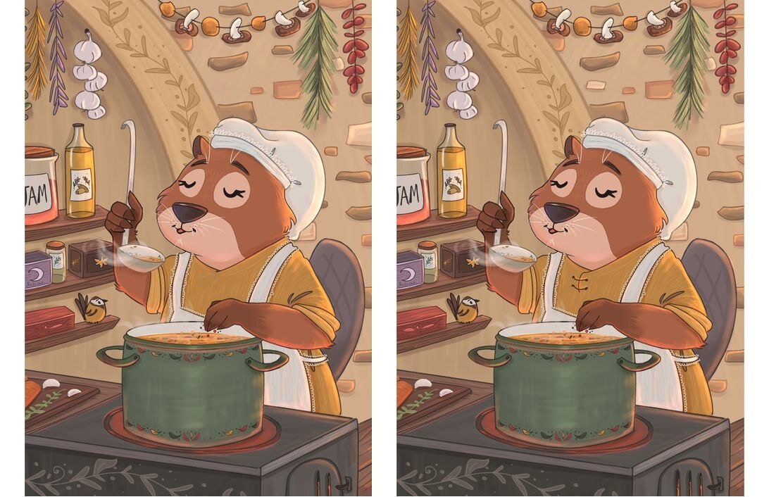 Привет, друзья! Сегодня у нас есть увлекательная задачка для вас. Мы подготовили картинку с медведицей, которая готовит что-то вкусное на кухне. Но это не просто картинка - это игра на внимательность! 🧐 Ваша задача - найти 5 отличий между двумя почти одинаковыми изображениями. Посмотрите внимательно, ведь отличия могут быть где угодно: в предметах на кухне, в одежде медведицы или даже в её выражении лица. Готовы к вызову? Поделитесь в комментариях, сколько отличий вы нашли и как быстро справились с задачей. И не забудьте вызвать друзей принять участие в этой забавной игре! 🐻👩🍳 Приятного времяпрепровождения и удачи в поисках!