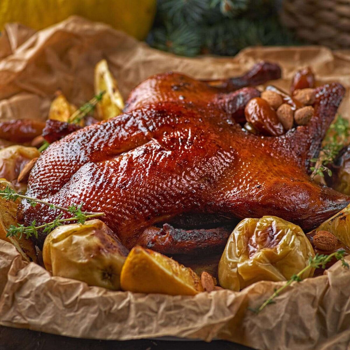 Утка по этому рецепту получается сочная и очень нежная, обязательно попробуйте приготовить её на свой праздничный стол. Птицу берём не менее 2кг. Хорошо промываем,просушиваем полотенцем и удаляем излишки жира. Натираем утку специями и солью, затем завернуть плотно в пищевую плёнку и убрать в холодильник на ночь. Яблоки нарезать крупными дольками убрав сердцевину. Присыпаем перцем и мускатным орехом, далее лёгкими движениями перемешиваем с мёдом . Достаем нашу отдохнувшую утку из холодильника и начиняем яблоками . Заворачиваем плотно в фольгу ,низ утки так же должен лежать на фольге ,уточка должна полностью быть запечатана. Переложим на противень. Выпекаем утку 60минут при температуре 200гр,а затем ещё столько же времени при температуре 160гр. Приятного аппетита!)