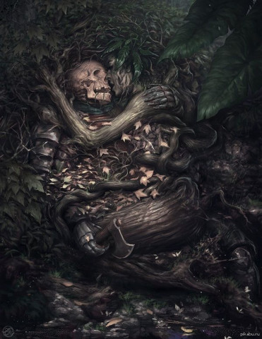 Надрёнок замер, пораженный увиденным. У самого края поляны, в тени огромных деревьев, на небольшом гранитном возвышении, заваленном пожухлыми листьями, сплелись в смертельных объятиях ветви и кости их бывших хозяев. Женщины, подобной хозяйке леса, и мужчины — по косвенным признакам надра. Его останки задеревенели, но не утратили утонченности, присущей надрам, а полусгнившие уши еще хранили характерную остроконечную форму. И ко всему прочему, на мёртвом оказались надрийские латы, меч Эландер, — Ольян вспомнил картину, висевшую у бабушки на стене и изображенного на ней дедушку с похожим мечом, — воткнутый в грудину мертвого надра, и… медальон с гербом Армиров — их семейной ветви.
